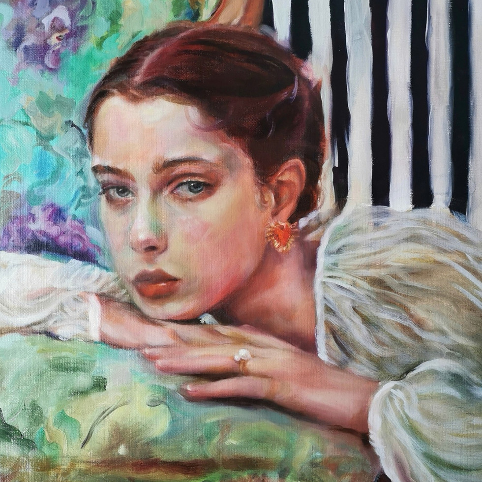 Entre flottement et immersion, ce visage se laisse deviner comme à travers une eau mouvante. Le ruban rouge, éclat vibrant, contraste avec le bleu profond et les mèches qui semblent flotter. Sous la surface évoque cet espace intime où se rencontrent deux mondes : l’apparence visible et ce qui se vit à l’intérieur.